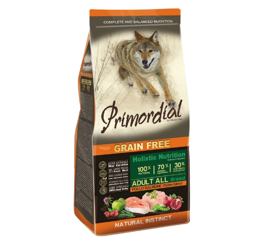 פרימורדיאל ללא דגנים – עוף וסלמון, הוא מזון מלא, נטול דגנים, עשיר בחלבונים ומכיל את הרכב חומצות האמינו המתאים. בשר העופות שגודלו רק על הקרקע ולא בכלובים, מספק חלבונים קלים לעיכול עם טעם נפלא שכלבים אוהבים.  דגי הסלמון מספקים חלבון קל לעיכול וכמו רוב הדגים הם מקור עשיר לחומצת השומן אומגה-3 התורמת לבריאות העור והפרווה ומועילה ללב ולמערכת כלי הדם.