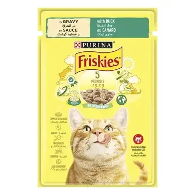 פריסקיז מעדן לח לחתולים בטעם ברווז ברוטב עשיר מציע נתחי עוף עסיסיים וטעימים, המעניקים 100% תזונה מלאה ומאוזנת עם ויטמינים ומינרלים חיוניים.סדרת הפאוצ'ים מציעה מגוון טעמים, המעניקים גיוון תזונתי מושלם לחתולים.