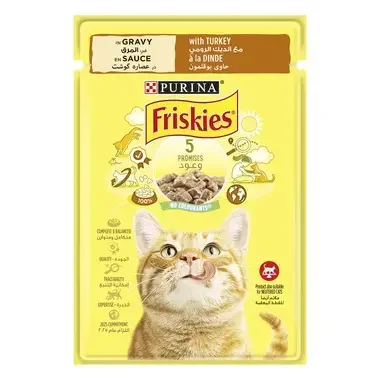 פריסקיז מעדן לח לחתולים בטעם הודו ברוטב עשיר מציע נתחי בשר הודו עסיסיים וטעימים, המעניקים 100% תזונה מלאה ומאוזנת עם ויטמינים ומינרלים חיוניים.סדרת הפאוצ'ים מציעה מגוון טעמים, המעניקים גיוון תזונתי מושלם לחתולים.