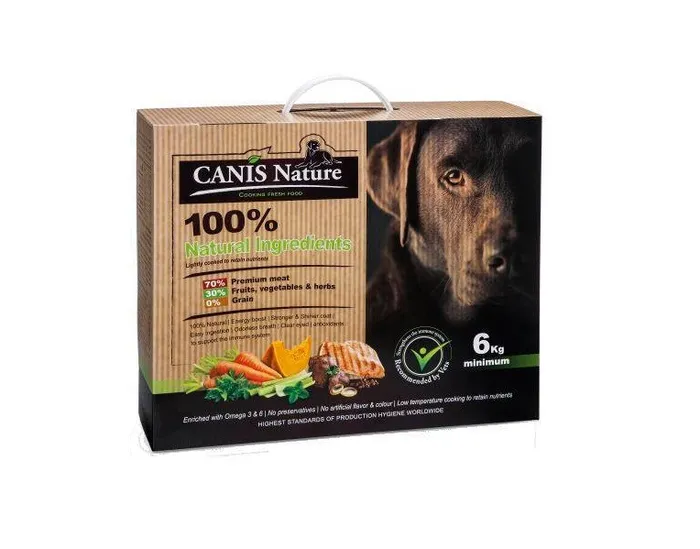 קאניס נייצ'ר מזון רטוב ורך לכלבים מכל הגזעים מותאם לכל שלבי החיים.המזון הינו מזון משלים לכלבים ומומלץ לצרוך אותו בנוסף למזון מלא ומאוזן לכלבים.רכיבים: חזה עוף, עוף טחון, גזר, כבדי עוף, כוסמת, סלק, עמילן תפו"א, דלעת, עדשים ירוקות מונבטות, בננה, תפוח, שמן חמניות, עלי נענע, פטרוזיליה, שמן דגי קוד, מלח לימון, חומצה סורבית.*כל ארגז מכיל 6 ק"ג ומחולק ל-24 יחידות כל משקל יחידה הינו 250 גרם.*ללא דגנים.*תזונה העשויה מחומרי גלם טבעיים בלבד.*מכיל 70% רכיבים בשריים איכותיים, 30% פירות וירקות ו-0% דגנים.*מומלץ ע"י וטרינרים ועומד בתקן המחמיר של ה-FEDIAF לתזונה בריאה.