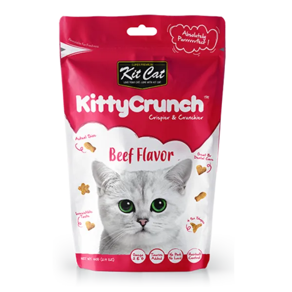 קיט קאט חטיף קראנצ'יקיט קאט קיטי קראנץ' נוצר על ידי תזונאים שהם אוהבי חתולים ועשויים עם טוב של מרכיבים שנבחרו בקפידה.KittyCrunch מיוצר לשלמות עבור חתולים. עם מגוון טעמים טעימים ו-4 צורות מהנות, הנגיסות הפריכות שאי אפשר לעמוד בפניהן הן לא רק טעימות אלא גם עוזרות לנקות שיניים.מגיע ב-6 טעמים דלי מיאו!תירס, קמח גלוטן תירס, קמח עופות, אורז, שומן עופות, חלבון מהחי מעוכל (בטעם בקר), חלב, קמח טלה, קמח בשר ועצמות, סטארין דקלים, שמרים יבשים, מלח, כולין כלוריד, דיקלציום פוספט, תוסף ויטמינים חיוניים (ויטמין A, ויטמין D3, ויטמין E, ויטמין K3, ויטמין B1, ויטמין B2, ויטמין B6, ויטמין B12, חומצה ניקוטינית, חומצה פנטותנית, חומצה פולית, ביוטין) תוסף מינרלים חיוניים (נחושת, ברזל, מנגן, אבץ, יוד , סלניום), שמן פרחי שמש, שמן סלמון, סיבים אכילים (צלולוזה), אשלגן כלורי, חומר טעם (בטעם בקר), חומר משמר (חומצה פרופיונית, ויטמין C, ויטמין E), טאורין, אוליגוסכריד פרוקטו