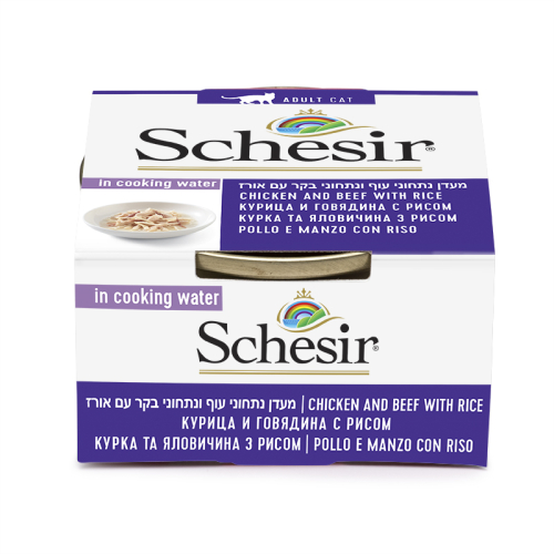 שזיר חתול עוף ובקר עם אורז במים 85 גרם