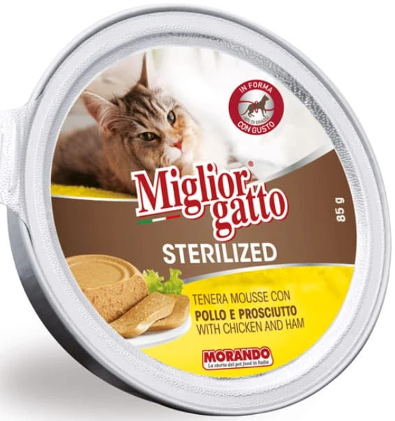 שימורים לחתול מסורס,Migliorgatto, מוס בטעם עוף וחזיר 85 גר'