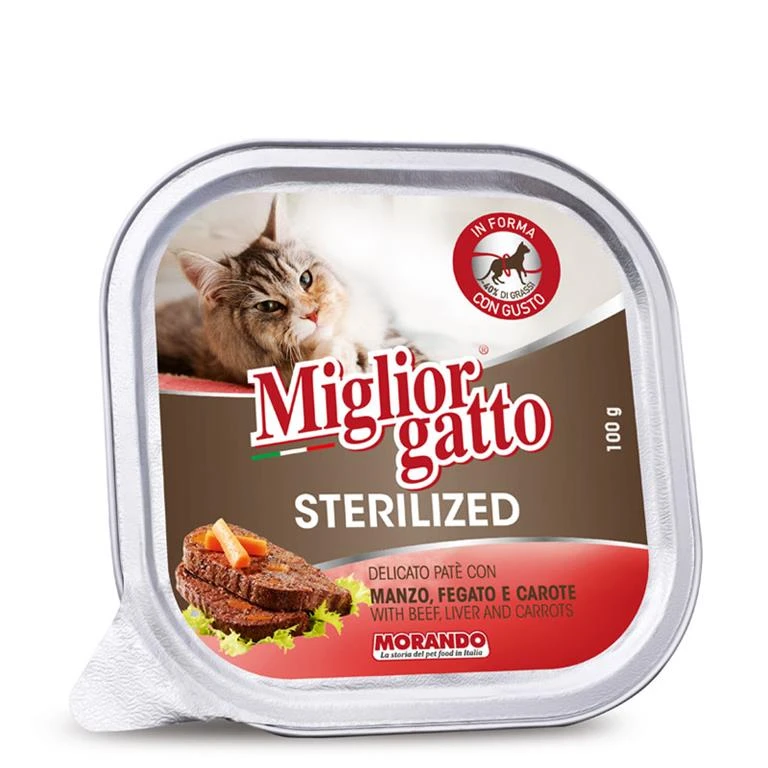 שימורים לחתול מסורס,Migliorgatto, פטה בטעם בקר,כבד וגזר 100 גר'