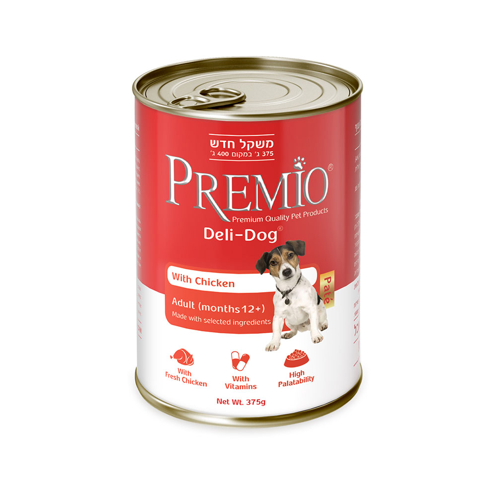 שימורים פרמיו לכלב דלי-דוג עוף 375 גרם