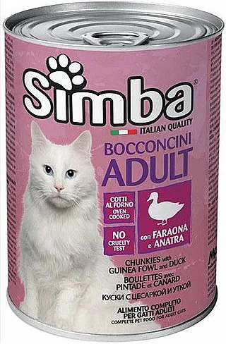 שימור סימבה נתחי בשר פניניות וברווז (400 גרם)מזון רטוב לחתולים, בשר שעבר בישול בתנור ומתובל בסגנון צרפתי. מכיל ערכים תזונתיים גבוהים, חלבון ושילוב של ויטמינים, נח לעיכול. מתכון חתיכות בשר פניניות וברווז, ללא צבעי מאכל, ללא GMO, תוצרת איטליה.