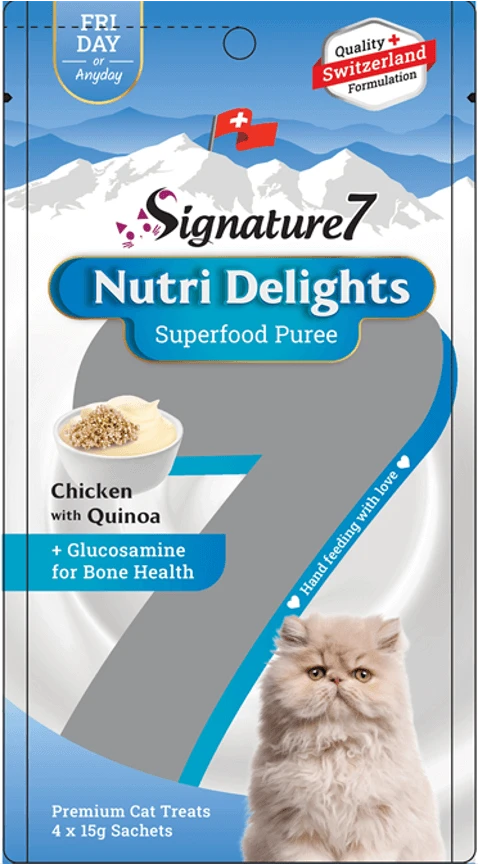 שלוקים מבית SIGNATURE 7 לחתול בטעם עוף וקינואה. מעדן מוס פרימיום לחתול, 4 יחידות במארז. בטעם עוף וקינואה בתוספת גלוקוזאמין לבריאות העצם.
