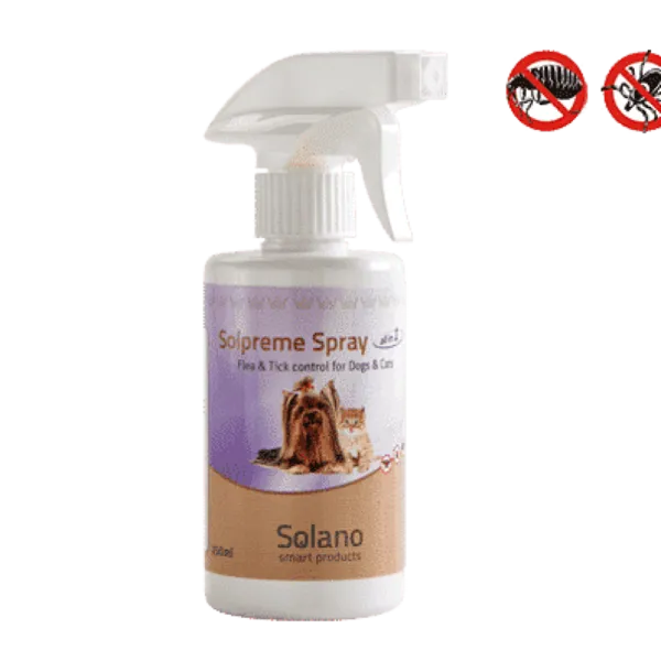 תרסיס סולפרם 250 מ"לסולפרים לגד פרעושים וקרציותמוצר חדשני אשר קוטל קרציות, פרעושים וזבובים.מכיל חומרים מהדור החדש שהטפילים טרם פיתחו נגדם עמידות.בזכות שימוש בטכנולוגיה יצור חדישה ופורמולה ייחודית הופך אתSolpreme Sprayלהיות הספריי המתקדם בעולם. הפורמולה אשר מכילה פילם פורמינג (Flim Forming) מצפה כול שערה בנפרד ונותנת הגנה מלאה לכול אורך הפרווה.החומר הפעיל, דינוטפורן (Dinotefuran), קוטל את הטפיל על ידי מגע בלבד וכך נמנעת הידבקות במחלות ואלרגיות המועברות על ידי הטפילים.Solpreme Sprayנכנס לפעולה תוך מספר שניות ומספק תוצאות מדהימות בקטילת הטפילים.Solpreme Sprayקוטל את הטפיל לאורך כול שלביי החיים שלו משלב ביצה ועד פרעוש בוגר. בזכות היעילות הרבהSolpreme Sprayמונע אלרגיות והדבקות במחלות אשר מועברים ע"י הטפילים.מוצר זה בטוח ביותר לבעל החיים ,למשתמש ולסביבה.מתאים לשימוש בגורים מגיל 7 ימים.ניתן לשימוש בכלבות הרות ומניקות.Solpreme Sprayהטוב ביותר עבור חיית המחמד שלך.הוראות שימוש:רססו את בעל החיים עד שהפרווה תהיה לחה. לאחר מכן יש לעסות את פרוות הכלב בכדי להחדיר את החומר בצורה המיטבית.אין לרסס ישירות על הפה, עיניים ופנים האוזן.יש לשטוף ידיים בסבון לאחר השימוש.