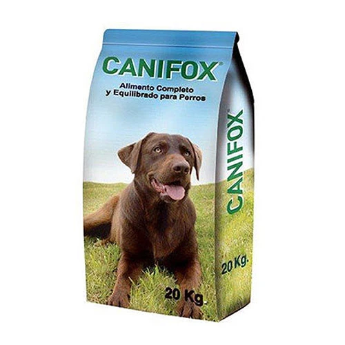 Canifox. מזון יבש לכלב. אריזת 20 ק"ג. תוצרת ספרד. חלבון: 22%, שומן: 8%, תאית: 2.6%, אפר: 9.5%, רטיבות: % 10, סידן: 3.5%, זרחן: 1.4%, מלח: 1%, ויטמין D3: 1300 יח"ב ק"ג. בשר ומוצרים מן החי, דגנים, שמנים ושומנים, מינרלים, מוצרי לוואי מן הצומח, ויטמינים.