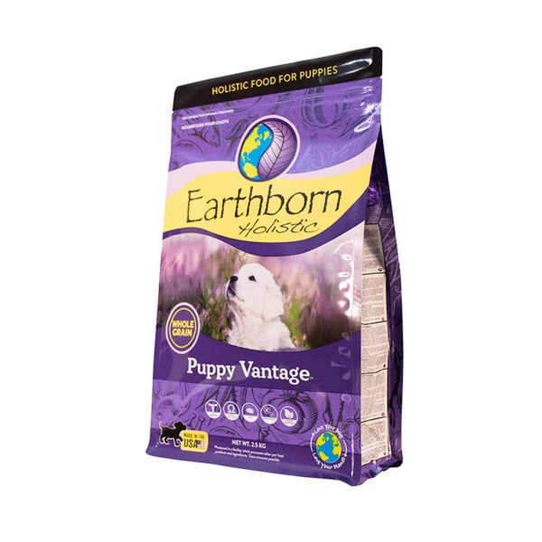 EARTHBORN Puppy Vantage מזון אלטרנטיבי מתקדם לגורי כלבים, המכיל דגנים מלאים וחומרי גלם מזינים ומובחרים כגון עוף (מעל 20%), דגנים מלאים (מעל 12%) ופירות וירקות (מעל 9%). המזון מספק את כל הצרכים התזונתיים ומהווה תזונה מלאה ומאוזנת. ללא צבעי מאכל, חומרי טעם או משמרים מלאכותיים. עומד בדרישות התקן AAFCO האמריקאי לתזונת גורי כלבים, כלבות הרות ומניקות.