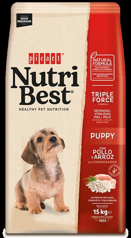 Nutribest. מיועד לגורי כלבים עד גיל שנה מכל הגזעים. אריזות: 3, 15 ק"ג חלבון:30, שומן: 14, אפר: 7 ,תאית: 3, רטיבות:8, סידן:1.6 זרחן:1.1,מלח: 1.03, אומגה 3: 0.11,DHA: 0.03. ברזל: 17.1 מ"ג, יוד: 1.29 מ"ג, נחושת: 8.6 מ"ג, מנגן: 10.3 מ"ג, אבץ: 102.9 מ"ג, סלניום: 0.25 מ"ג, ויטמין A: 19,285 יח', ויטמין D: 1540 יח', ויטמין E: 94 מ"ג. בשר עוף מיובש* 24%, חיטה*, תירס, רמולאז' חיטה*, שמרי בירה*, שומן מן החי, בשר עוף מיובש* 6%, חרוב, שעורה, אורז* 4%, ציפת סלק*, עוף שעבר הידרוליזה*, שמן סלמון*, אצות* 0.5%, מינרלים, פרהביוטיקה* (MOS), תמצית יוקה שידיגרה*, ויטמינים. *מרכיבים טבעיים