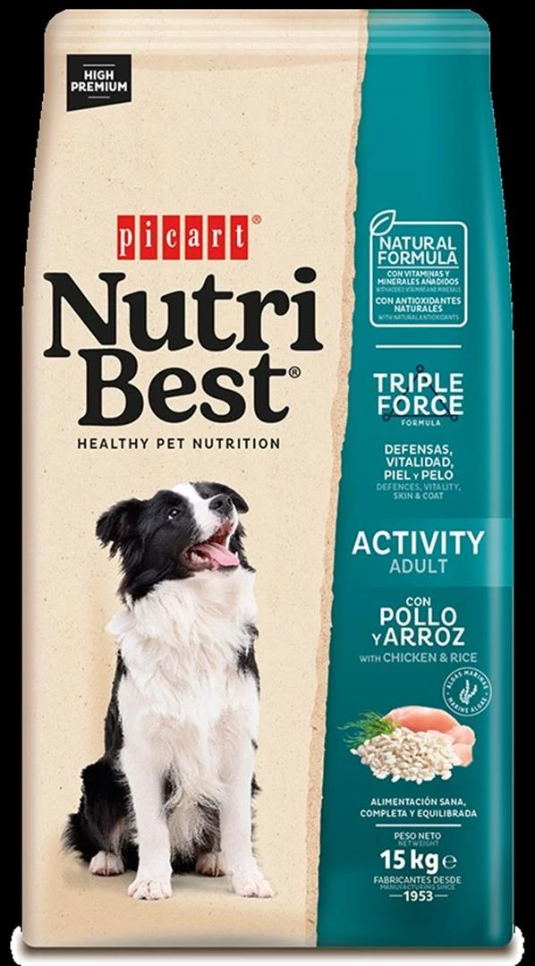 Nutribest. מיועד לכלבים פעילים או כלבי עבודה מכל הגזעים. אריזות: 15 ק"ג חלבון:30, שומן: 14, אפר: 7,תאית: 3, רטיבות:8, סידן:1.6 זרחן:1.1,מלח: 1.03, אומגה 3: 0.11, DHA: 0.03. ברזל: 17.1 מ"ג, יוד: 1.29 מ"ג, נחושת: 8.6 מ"ג, מנגן: 10.3 מ"ג, אבץ: 102.9 מ"ג, סלניום: 0.25 מ"ג, ויטמין A: 19,285 יח', ויטמין D: 1540 יח', ויטמין E: 94 מ"ג. בשר מיובש*24%, חיטה*,תירס, רמולאז' חיטה*, שמרי בירה*, שומן מן החי*, בשר עוף מיובש* 6%, חרוב*,שעורה*, אורז 4%, ציפת סלק*, עוף שעבר הידרוליזה*, שמן סלמון*, אצות* 0.5%, מינרלים, פרהביוטיקה *(MOS), תמצית יוקה שידיגרה*, ויטמינים.
